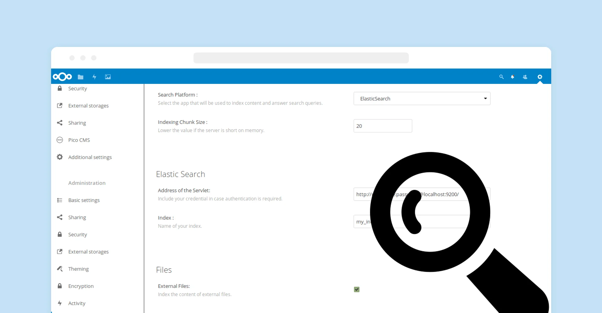 Nextcloud includes a powerful full-text search engine capable of using ElasticSearch as back-end. Its flexible plugin-based interface enables search capabilities beyond files and accommodates other back-end solutions like Apache Solr.