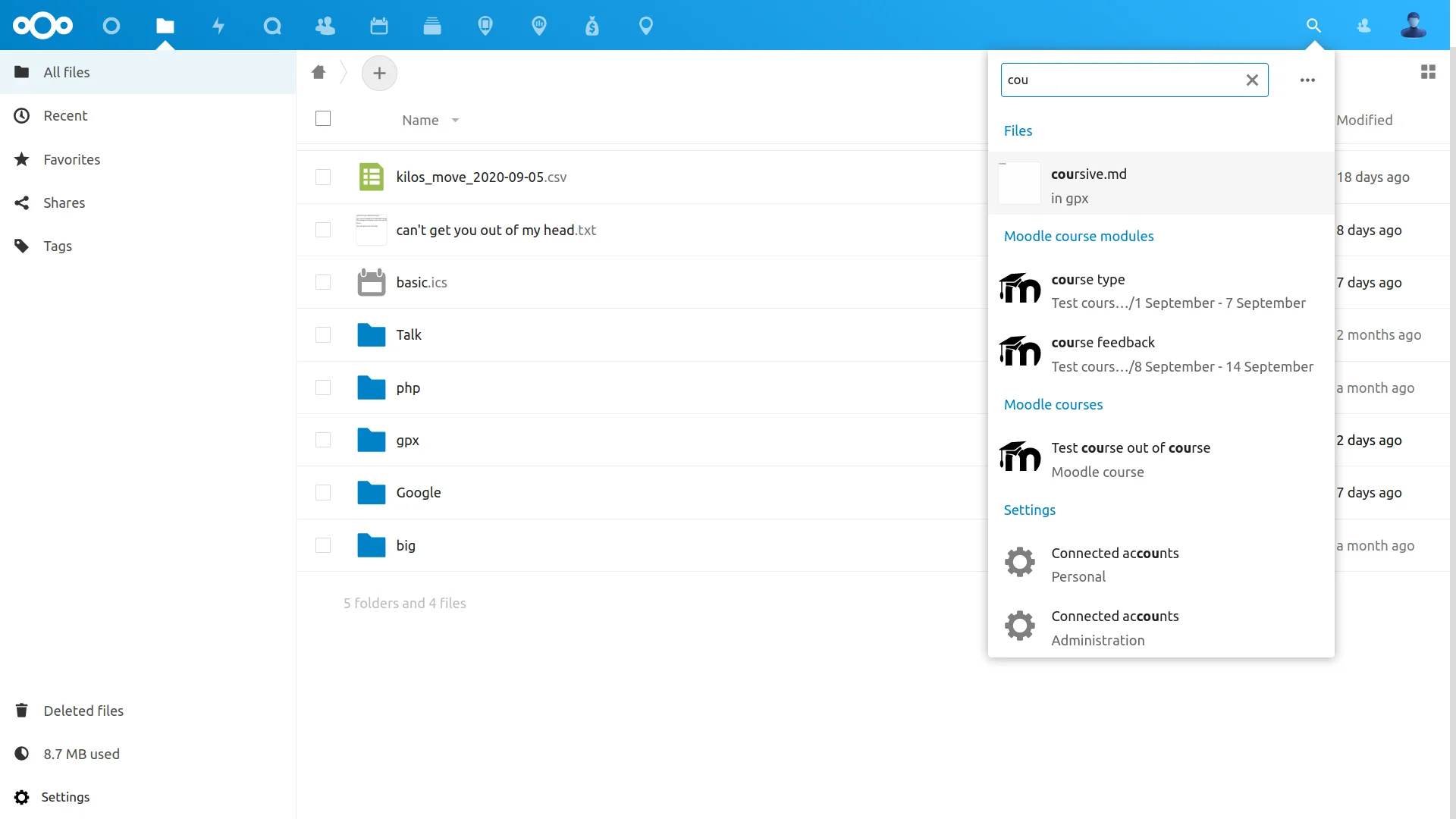On the top-right of your Nextcloud window, a search glass shows search results from all over Nextcloud. Additional search providers can be installed and over a dozen different search providers are available to show you Github issues, Moodle courses, Jira tickets and more